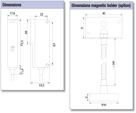 Rotational speed measurement for many applications: The hydrotechnik's rotational speed sensor RS 110 uses pulsating red light (LED) refl ected by a special tag at the rotating target. By using a polarisation fi lter, only the refl ected light impulses are evaluated, disturbing refl ections (e.g. unevenness of the surface, bright metal parts, keyways or high-contrast areas) are not detected. This achieves a reliable rotational speed measurement from distances between 50 mm and 4 m*.25 refl ection tags are included. Enter the number of used reflection tags as calibration value into the measuring instrument. |